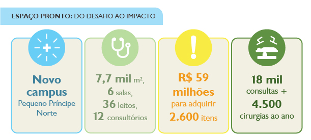 Frente a esse cenário, o Hospital elaborou o projeto Espaço Pronto — Para a Saúde das Crianças e Adolescentes, que busca mobilizar a sociedade para equipar o novo hospital-dia. O investimento total previsto é de R$ 129 milhões, dos quais R$ 70 milhões já foram captados graças às parcerias com a Secretaria de Estado da Saúde do Paraná (Sesa) e a Itaipu Binacional. Restam ainda cerca de R$ 59 milhões a serem levantados, recursos fundamentais para a compra de mais de 2.600 itens entre equipamentos médico-hospitalares, mobiliário, tecnologia e insumos.