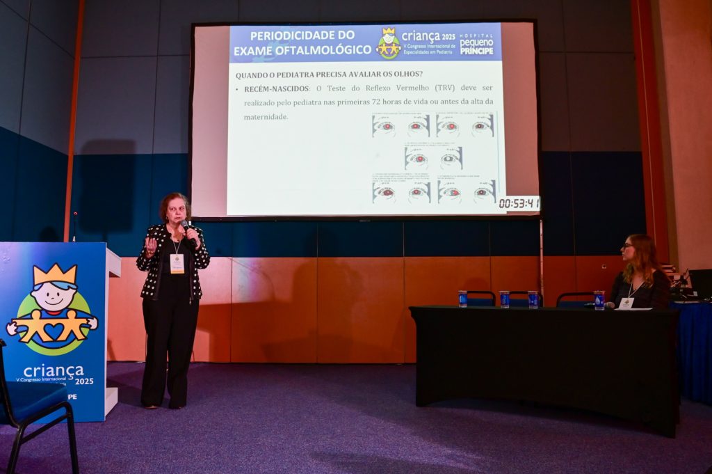 A oftalmologista pediátrica Pérola Grupenmacher Iankilevich destacou a importância do diagnóstico precoce dos distúrbios visuais na infância. Afinal, essa é a fase ideal para detectar alterações visuais que, se não tratadas a tempo, podem prejudicar o desenvolvimento neuropsicomotor e a qualidade de vida da criança. Ela chamou atenção para erros refracionais comuns, como miopia, hipermetropia e astigmatismo, com ênfase especial na ambliopia — condição que pode levar à perda visual irreversível se não diagnosticada precocemente. Entre os sinais clínicos citados estão a aproximação excessiva aos objetos e o desinteresse escolar. Ela reforçou a importância da atuação integrada: “Quando o pediatra identifica algo fora do esperado, deve encaminhar o paciente ao oftalmologista. É um trabalho em rede, com um olhar sensível para além da clínica.”