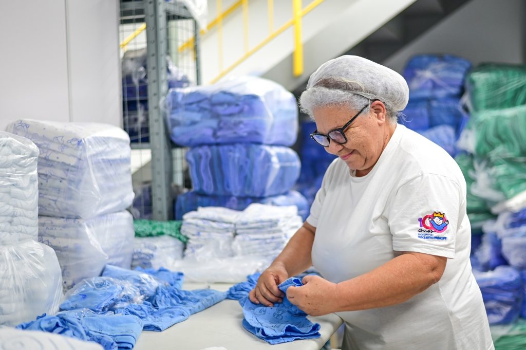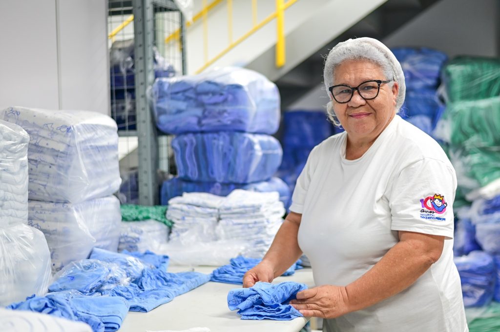 “Levo os enxovais para o convênio e para o SUS. Depois retorno e começo a dobrar os pijaminhas — eu amo essa parte. Faço tudo com muito cuidado: separo por tamanho, dobro e coloco no pacotinho para as camareiras levarem. Hoje, não tenho tanto contato com crianças como antes, mas ainda tenho um pouco. Esses dias, por exemplo, vi um menininho. Ele me olhou, fez um gesto e depois me mostrou uma joaninha de brinquedo, dessas que grudam no dedo. Ele disse: ‘É para você.’ Eu peguei e colei no meu crachá. E ainda está comigo até hoje. Gosto muito deles. Acho que é por isso que, por onde eu passo, sempre tem esse carinho. Gosto muito de estar com as crianças, de brincar, de cuidar.”