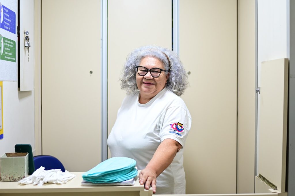“Antes disso, uma amiga que já trabalhava aqui até tinha me convidado para fazer um currículo, mas eu dizia que não queria trabalhar em hospital, que tinha dó. Só que, naquele dia, tudo mudou. Cheguei em casa, comprei o papel, preenchi o currículo à mão e entreguei para ela trazer aqui. Depois de um tempo, começaram a me chamar, mas para outras áreas, e eu recusava, porque deixava bem claro que queria a higienização. Isso aconteceu algumas vezes. Meu marido até disse que eles não iam mais me chamar, mas eu acreditava que, se fosse para ser, daria certo. Até que um dia, me ligaram e disseram: ‘Dona Laurentina, hoje estamos chamando a senhora para a higienização. A senhora pode vir?’ Eu nem acreditei. Vim, fiz tudo o que precisava naquele dia mesmo e já comecei.”