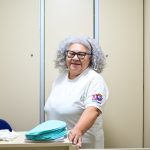 “Quando entrei, trabalhava em todos os setores. Comecei no quarto andar, depois fui para a cardiologia, em seguida para a infectologia, passei pela central de materiais e também pelo centro cirúrgico. Fiquei 20 anos na higienização. Chegaram a me chamar para a lavanderia antes, mas eu dizia que não queria sair, porque gostava muito do que fazia, principalmente o contato com as crianças. Faz cerca de um ano que estou na lavanderia e acabei gostando bastante também. Fui muito bem recebida aqui, e hoje me sinto feliz nesse novo setor. Posso dizer que minha vontade de trabalhar na higienização foi totalmente realizada: foram 20 anos dedicados a algo que eu nunca tinha feito antes e que acabou se tornando uma grande parte da minha vida.”